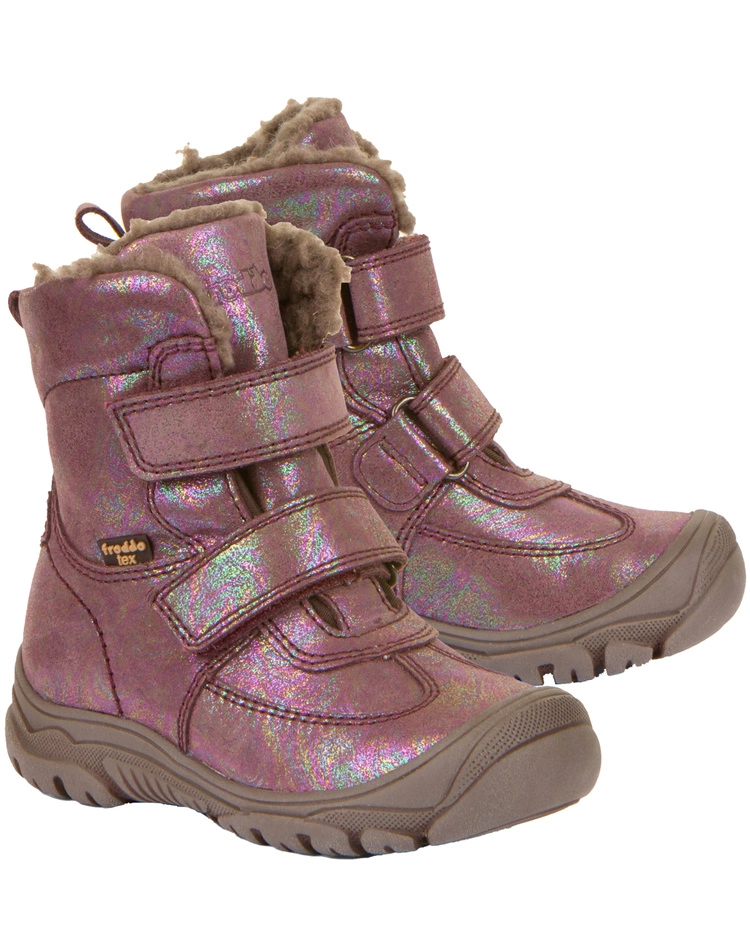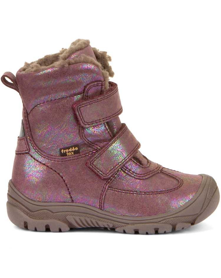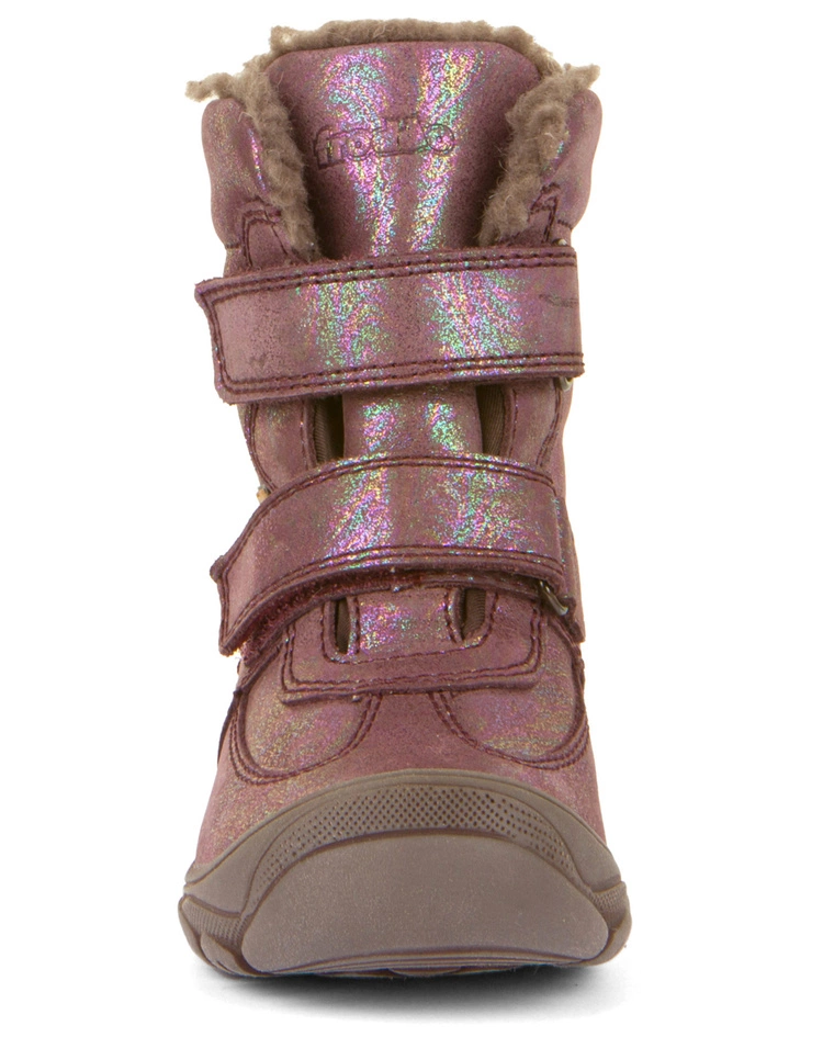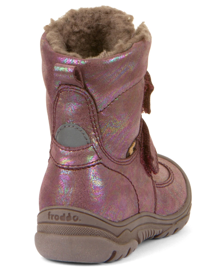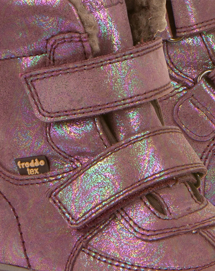 Mit den wasserfesten Klett-Boots LINZ WOOL HIGH UNI in magic von froddo® ist der Nachwuchs in der kalten Jahreszeit den ganzen Tag über komfortabel unterwegs. Die metallisch schimmernden Lederschuhe sind mit Lammfell ausgekleidet, wobei sich das Innenmaterial sanft und wärmend an die Kinderfüße schmiegt. Für ein einfaches An- und Ausziehen lässt sich der Einstieg mithilfe von 2 Klettverschlüssen individuell in der Weite anpassen. Die flexible Außensohle besteht aus thermoplastischem Gummi und ist zudem mit einem leichten Profil versehen. Somit ist für ein unbeschwertes Laufen auf glatten und matschigen Böden gesorgt.